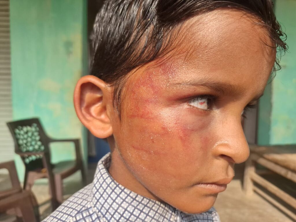 प्राप्त जानकारी के अनुसार, कक्षा दूसरी के 7 वर्षीय छात्र भागीरथी यादव से गिनती सुनाने में गलती होने पर शिक्षक उदय यादव ने उसकी बुरी तरह पिटाई कर दी.. पिटाई इतनी जोरदार थी कि बच्चे की आंख में खून उतर आया और चेहरा सूज गया.. बच्चे के गालों पर थप्पड़ के निशान साफ दिखाई दे रहे हैं..